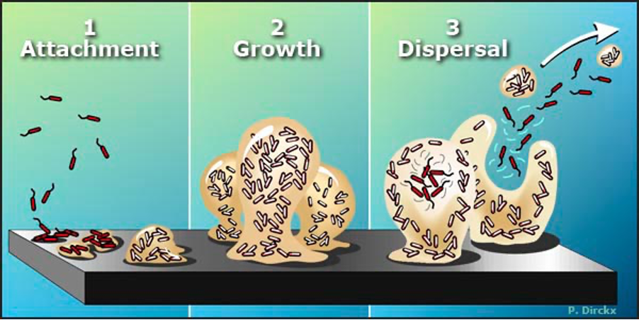 Biofilms have the ability to form in a matter of hours. They go through a 3-phase process as the image below shows.