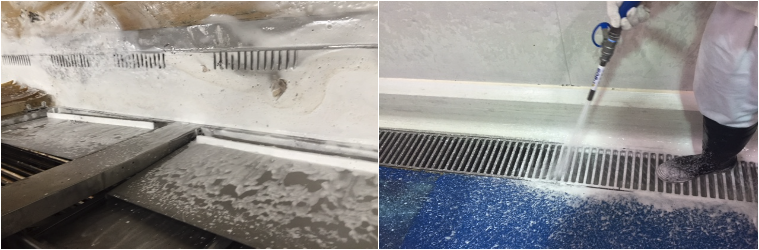 10 litres of BioProtect Industrial Treatment was foamed into the drains daily after the final daily wash-down. This is the point where the flow through the drains and interceptor is at its lowest point which allows for the greatest residual time in the system. Maximising the length of time the product is in the drains and interceptor is important as it maximizes the product’s impact. The cleaning staff reported the application of the product is very simple and that the application was completed in approximately 30 minutes.