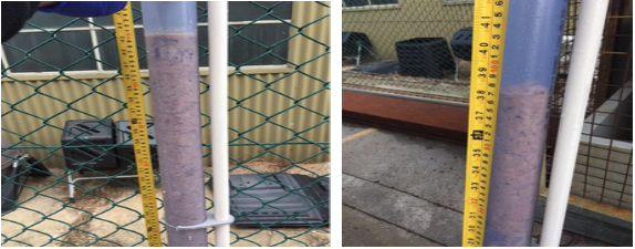 - Core sample taken 1st September 2017 (38 production days since last pumped) showing the solid loads in the grease interceptor, the first image shows the inlet chamber @ 84% of its capacity, the second image is the outlet chamber @75% of its capacity.