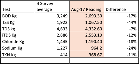 The above table shows the results of a 5-day composite wastewater test taken from the outlet side of the grease interceptor and compared against an average of 4 previous 5-day composite tests conducted. It is clear to see that there has been a good overall reduction in all the key parameters.