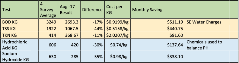 The above table shows the savings in wastewater levies and chemicals used to balance the PH in the grease interceptor, showing an overall monthly savings of $1,519.28.